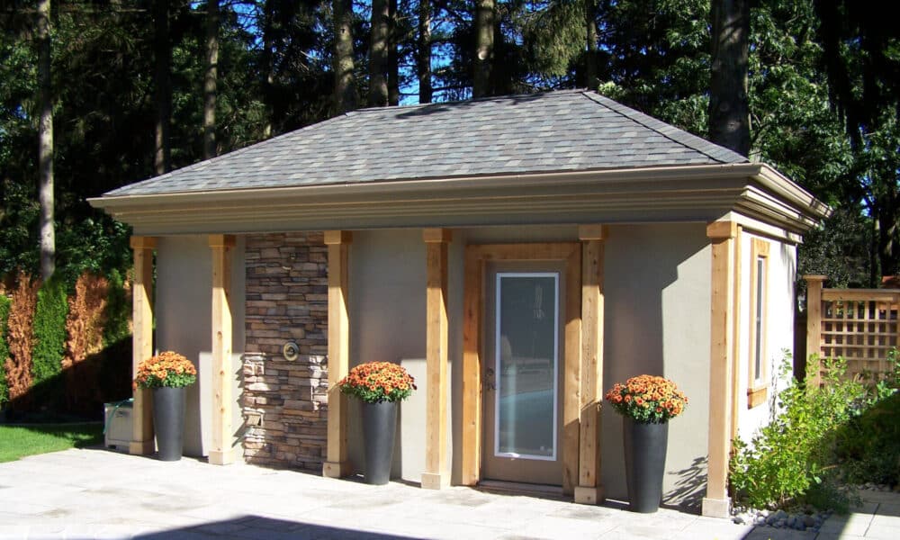 Pool cabanas and outdoor room structures designed for four-season lake country use. Full electrical and plumbing rough-in available. Built for the weeks when you are not there to watch them.