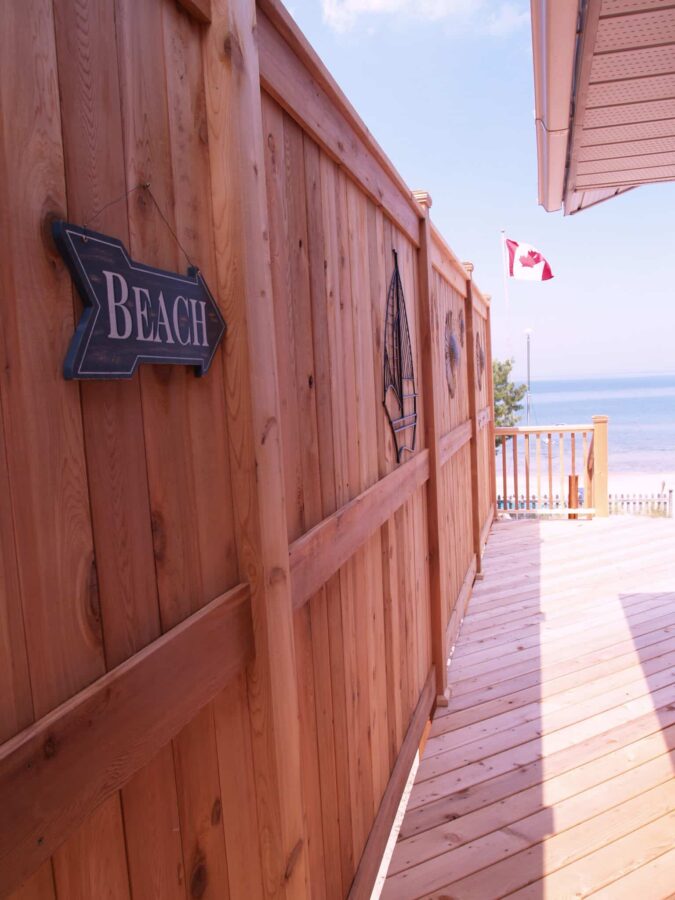 Cedar privacy and decorative fencing for Orillia, Oro-Medonte, Severn, and Ramara properties. Permit-compliant designs for waterfront lots, escarpment properties, and subdivision builds throughout the corridor.