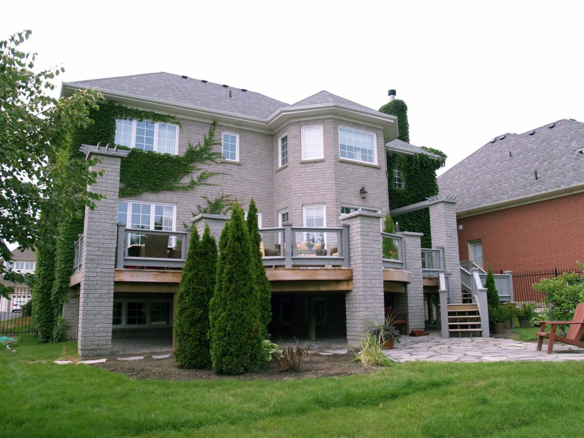 They were fastened to brick veneer cladding with two-inch Tapcons rather than to the structural framing of the house. There was no meaningful load path to the building. The ledger had no real connection to anything that could carry the weight. It was an incompetence failure, not a building code failure. We attach ledgers to structure, verify what is behind the cladding, and carry the load to the framing. On any property with brick or stone veneer, we confirm the structural connection before the design is finalized. Call (705) 717-2970.
