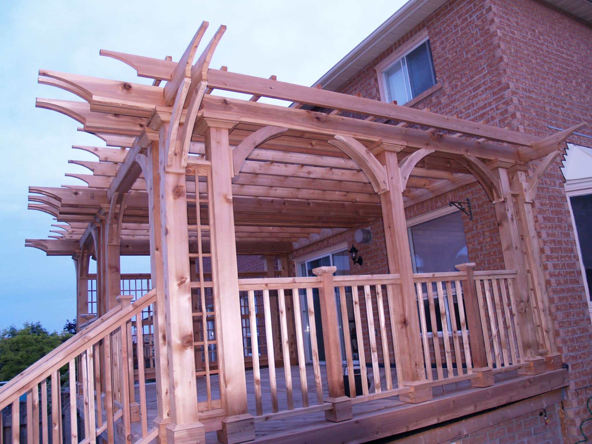 Freestanding and attached pergolas. Cedar, Douglas fir, and treated lumber options. Engineered for Georgian Bay wind exposure.